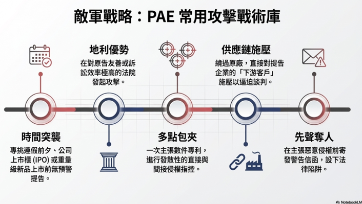 在實務上,PAE案件的成敗,往往並非取決於企業是否全面投入所有防禦工具,而在於是否能及早將決戰點前移、縮短對方回收投資的時間窗口,並系統性降低其訴訟投資報酬率。