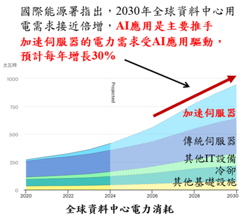 隨著人工智慧(AI)技術的快速發展,全球數據中心對電力與運算資源的需求急遽攀升。國際能源署(IEA)報告指出2030年全球資料中心用電需求接近倍增,AI應用是主要推手。加速伺服器的電力需求受AI應用驅動,預計每年增長30%。全球資料中心用電量在2030年超過1000兆瓦時(TWh),等同全日本用電量。然而,AI成長卻在能源面臨三項瓶頸,分別為電網建設速度落後算力需求成長、資料中心擴張面臨用水衝突、及地面資料中心擴張面臨社會與政治阻力等議題。