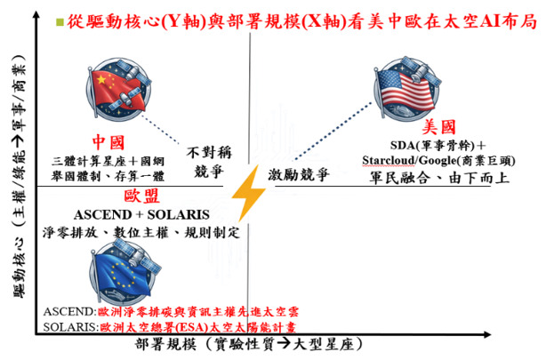 各國發展太空資料中心策略,美國是以軍事及商業趨動,同時又跨越實驗性質,走向大型星座國家。中國則聚焦軍事應用,部署規模雖離美國還有一段距離,但急起直追。歐洲則剛起步,聚焦主權與綠能,尤其是減碳議題,但規模離美國仍有一大段距離。