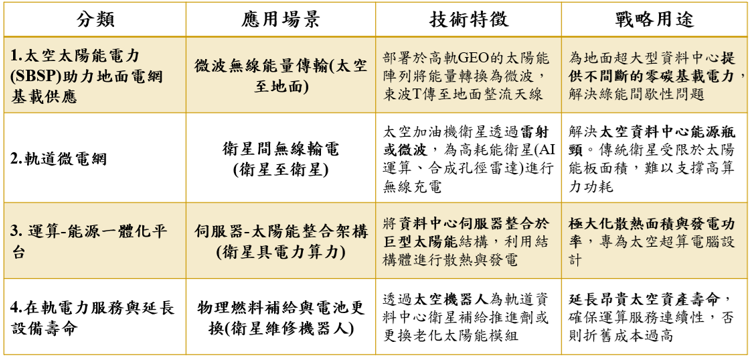 目前太空太陽能電力(SBSP)應用構想可分為以下幾大類:一是將太空發電用於地面能源供應,以微波等方式送電回地球;二是建立軌道微電網,在不同衛星間無線傳輸電能,形成在軌電力共享;三是打造「算力與能源一體化平台」,將伺服器與太陽能電力系統整合於單一衛星,讓每顆衛星即同時具備電力與運算能力;四是在軌電力維護與延壽服務,透過太空機器人為太陽能面板補充燃料、替換衰退模組或進行維修,延長太空資料中心壽命。這些構想目前都在探索階段,需要克服在軌對接、穩定傳輸以及系統冗餘等技術難關。