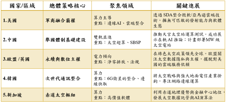 各國在太空算力與電力的布局與發展策略,呈現明顯差異如下:
