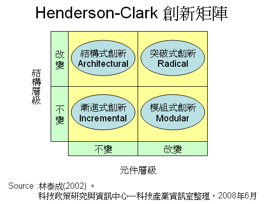 產品創新可分成兩類:產品應用創新以及產品設計創新。產品應用創新涵蓋功能上創新(需求端,市場拉力)與產品端創新(供給端,技術推力),圖一之創新元素表即是一例。產品設計創新即是以產品之改變為核心之創新內涵,知名典範者Henderson-Clark創新矩陣就是一例。Henderson-Clark創新矩陣橫軸為產品之底層元件層級之組合,例如不同零組件,而縱軸為整體結構層級。舉例來說,結構創新(Architectural Innovation)即是組成產品的基本元件不變,但是整體結構布局改變。也就是說,將相同元件進行整體結構之重新調整,進而產生新功能。Henderson-Clark創新矩陣之兩個軸線都是技術相關,而與市場拉力或消費者是無關。