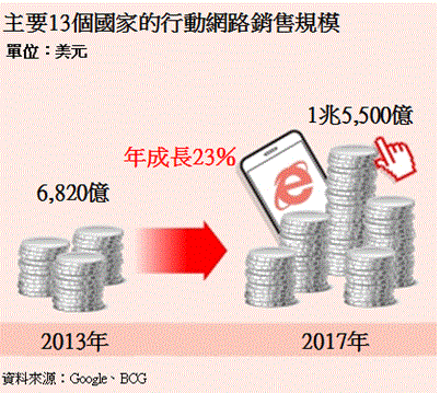 根據美國矽谷最大的創投基金-KPCB公布的數據,美國成人每天透過行動裝置使用數位媒體的時間從2011年的0.8小時增加至2.8小時,大幅成長3.5倍,佔整體數位媒體使用時間的一半以上(如圖一),顯示美國成人越來越傾向使用行動裝置從事休閒娛樂活動。從Google和波士頓顧問集團(BCG)發表的「全球行動網路經濟成長」報告亦顯示,全球主要13個國家的行動網路銷售規模到了2017年將高達1兆5,500億美元(如圖二)是2013年的2.3倍,到2017年時智慧手機平均售價相較2013年會下滑19%(如圖三),換言之,手機製造商的利潤將隨著智慧手機的普及率上升出現反向衰退。