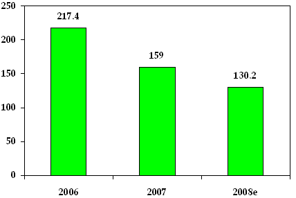 圖一、2006-2008摩托羅拉於2008年手機出貨量預估 (單位:百萬支)