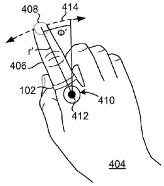 如 US ’587專利圖2所示, 微軟所揭櫫的新構想是智能環, 配戴在使用者食指的第一指節上; 該智能環可偵測使用者食指第二指節是伸直張開或彎曲收縮, 藉由判斷第二指節與第一指節的間距, 來操作螢幕上游標Y軸方向上的移動。