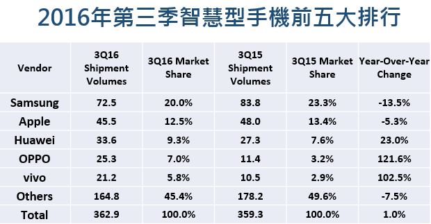 市場上崛起中的中國大陸智慧型手機廠商在2016年第三季又再一次搶走市場的眼光。根據Strategy Analytics統計,華為市場佔有率從8%增加到9%,IDC也認為其提高至9.3%。第四名的OPPO,在Strategy Analytics統計中,創下出貨量達到2160萬支的佳績,年成長率更高達140%,IDC也認為其年成長率達121.6%,市場佔有率在6%與7%之間。另外一家公司Vivo,同樣也表現強勁,不僅達到102.5%的年成長率,更吃下5.8%的市場佔有率,優於去年同期的3%市場佔有率。