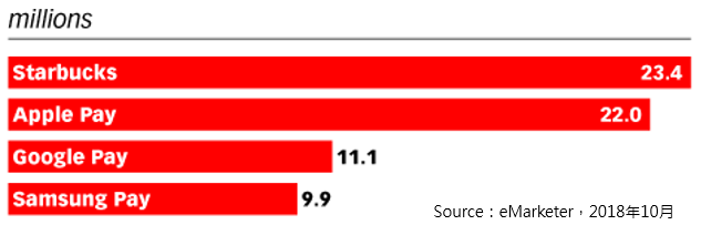 根據統計2018年,美國有2340萬行動支付用戶使用星巴克應用程式,比起蘋果支付的2200萬,谷歌支付的1110萬和三星支付的990萬都還要來得更多。