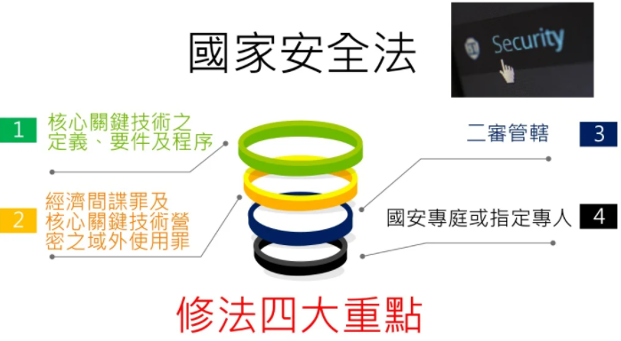 修正國家安全法,增訂「經濟間諜罪」,最高處12年徒刑、併科罰金1億元。同時增訂「國家核心關鍵技術營業秘密之域外使用罪」,最高處10年有期徒刑、併科5000萬元罰金。