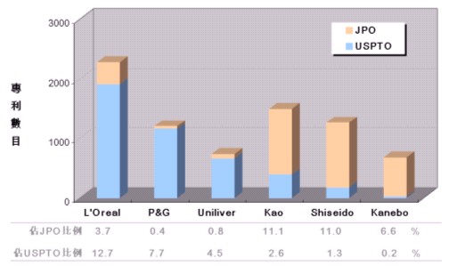 圖一 全球主要化妝品廠商美國與日本專利布局